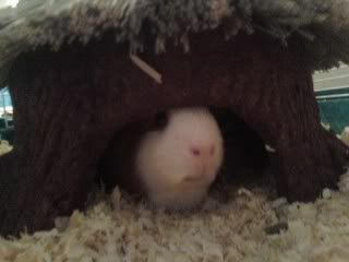 Cashew is a guinea pig that we acquired from my "sister" Nancy. She had two and those two had a few and Cashew wasn't too fond of his offspring. So, he came to live with us. We've had him for quite a few months, and he's just a complete lovebug. He loves to be held, he loves carrots and he loves to talk to me when I'm in the kitchen. Anyways, I bought a plastic house for our other guinea pig, but when he died I cleaned it and gave it to Cashew. Well, he's been driving me insane because he chews on it and it makes this horrible noise. Not to mention the fact that I paid like $25 for it and it kills me that he's eating it. So, two weekends ago Norman and I were down in Sacramento and my mom bought Cashew an edible house. It's made of alfalfa and honey and 100% of it is edible. Well, here he was on day one: