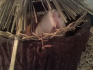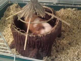 He's officially eaten all of the roof over his head. When I go over there now, he sticks his nose out of the top and sniffs my hand like "Hi Mom! Can you see me?"