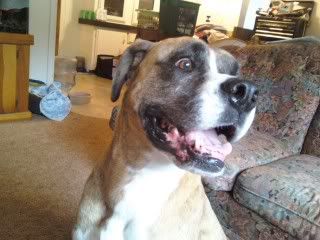 So last week, on Thursday, Linlah dropped off her and Scout's dog, Red. Red is a boxer and is seriously the best dog I've ever met. He has the most amazing manners ever, except when he wants to sit at your feet, as he doesn't care that your feet are under his 70 lb. butt. We had the pleasure of watching him while they went out of state for Linlah's son's wedding. She came back and got him on Tuesday, and honestly, I miss his goofy-ness. This is the picture I got as Linlah pulled out of our driveway on Thursday morning: