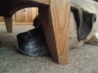 And this is the picture of him when I had McDonald's french fries and wouldn't share with him. I sat down on the floor in front of the coffee table and after telling him "no", he laid down and put his face under the table. He is the cutest!
